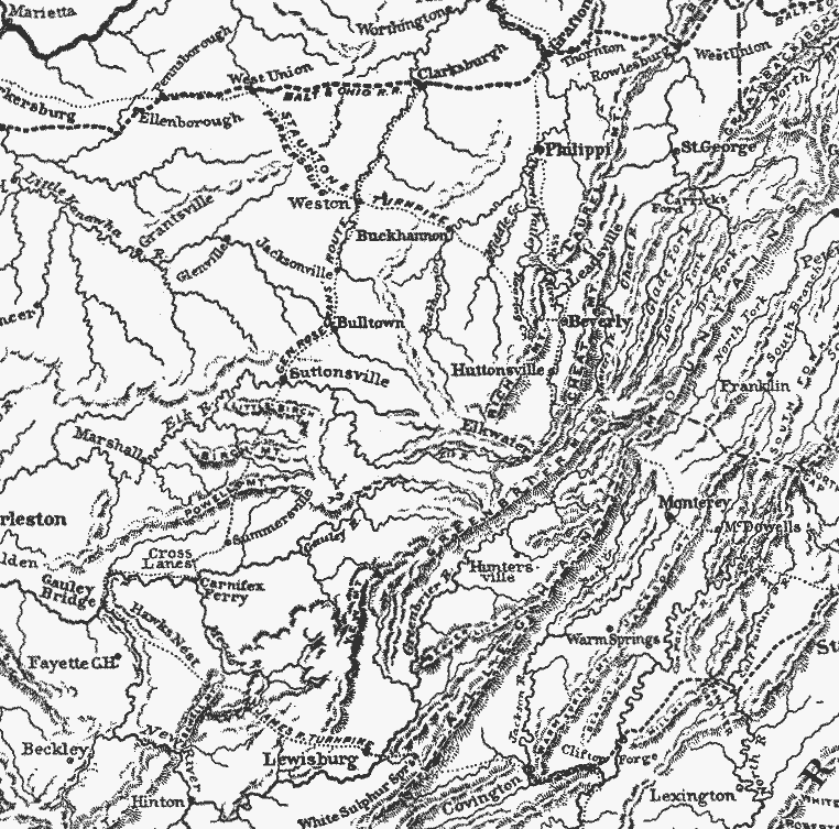 How to cite this article: Rickard, J. (4 October 2006), West Virginia in 1861: Central Area, https://www.historyofwar.org/articles/maps_century_1_129_west_virginia_detail.html