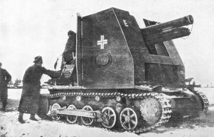 The 15cm sIG33(Sf) auf Panzerkampfwagen I Ausf B was produced by fitting a 15cm infantry gun on the chassis of a Panzer I Ausf B, protected by a tall boxy superstructure. This example was captured by the Red Army early in 1942.