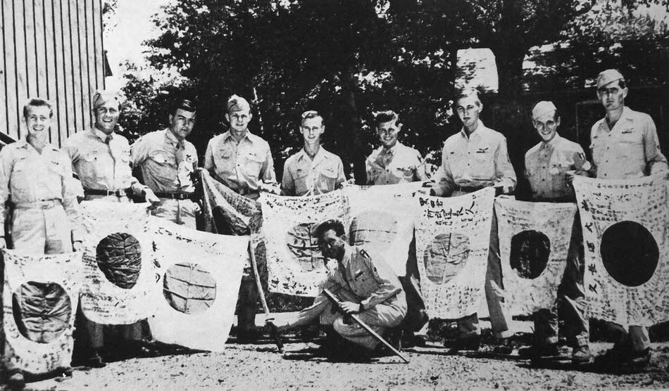 Here we see some of the pilots from the 1st Air Commando Group, originally formed to support Wingate's Chindits before becoming a key part of the air supply operation for the 14th Army. Here we see them with various Japanese flags captured during the invasion of Burma of 1945.