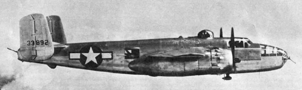 Here we see a North American B-25J Mitchell in flight. This angle shows us the new position of the dorsal turret, just behind the cockpit, which made room for better waist gun positions. We also see the glazed bombardier's nose with its gun and the tail gun. The tail gunner's position is hidden in this picture.
