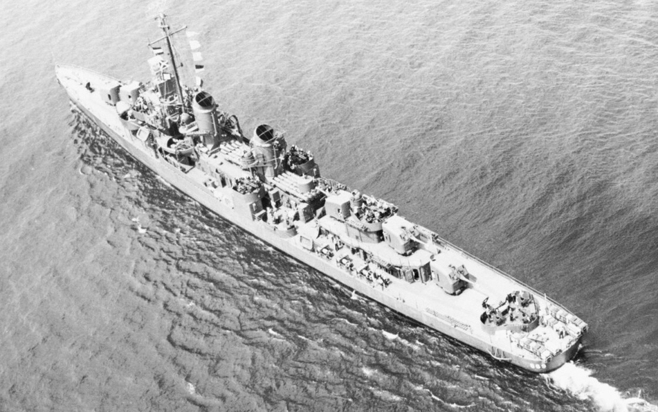 Here we see the Fletcher class destroyer USS Cotten (DD-669) off New York on 14 August 1943, a month after she had been commissioned. The picture was taken from an aircraft based at the Naval Air Station, New York.