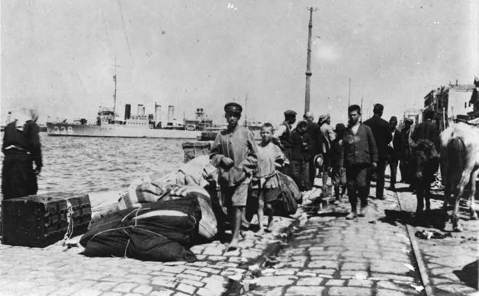 Here we see the Clemson Class Destroyer USS Litchfield (DD-336) at Smyrna during the evacuation of 1922, with some of the refugees waiting on the dockside. This scene looks rather too calm to be during the worst of the fire and evacuation.