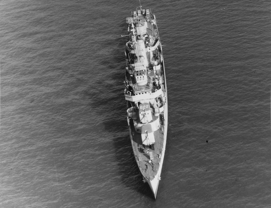 Here we see the Gleaves class destroyer USS Maddox (DD-622) from above at New York on 17 November 1942, the month after she was commissioned. Note her hull number painted on top of the second turret.