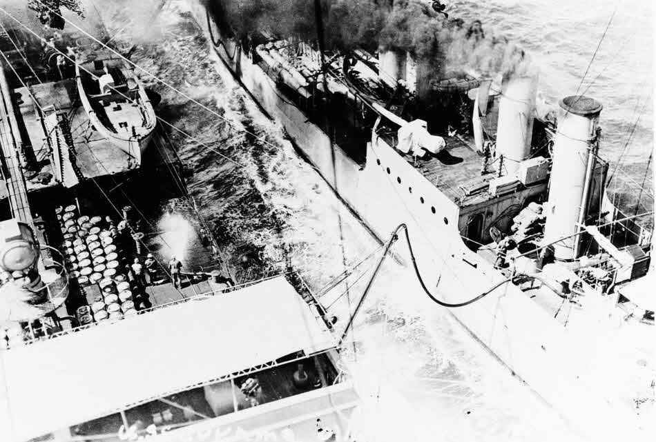 Here we see the Clemson Class Destroyer USS Sumner (DD-333) being refueled from the Cuyama (AO-3) at sea, c.1925. This picture was taken only ten years after the US Navy first developed the side-by-side refueling system, which was much more effective than the astern system used by the Royal Navy at first.