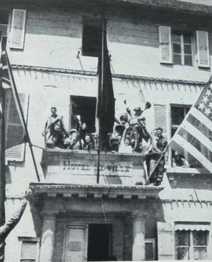 Here we see three Allied flags flying from the town hall at Cherbourg, which fell to a mainly American force in late June 1944. Only the US flag can be clearly identified in this shot, while the flag on the left could be the Australian or New Zealand flag or a British naval ensign.