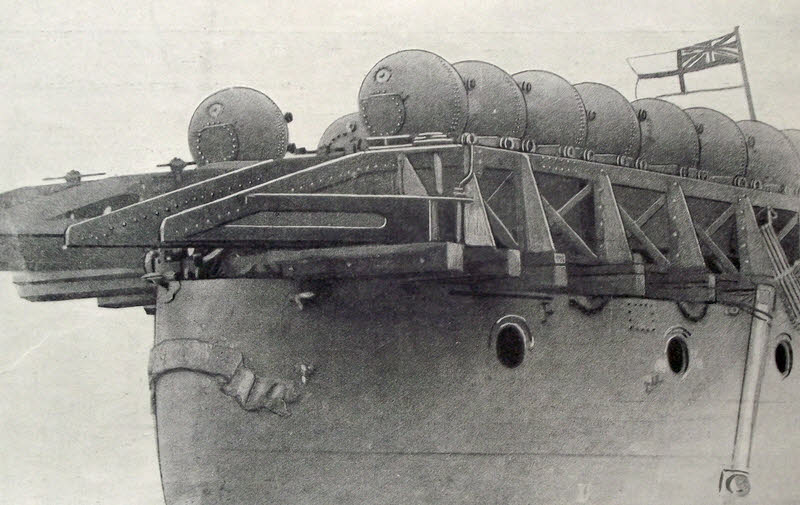 Here we see the stern of a British minelayer, with two sets of mine laying rails complete with round sea mines. The mines were dropped off the back of the ship as she moved.