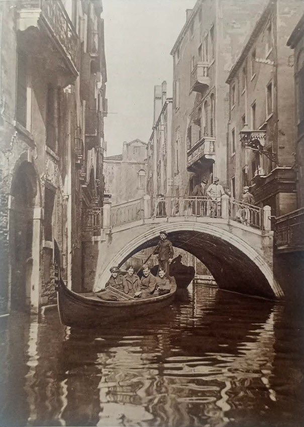 Here we see a group of British soldiers relaxing in Venice, probably in 1918 or 1919. The city was not far from the front line throughout the First World War, so was a standard destination for soldiers on leave. It came closer to the front line during the Austrian advance after the battle of Caporetto when the Austrians reached the Piave, only twenty miles to the east of the city.