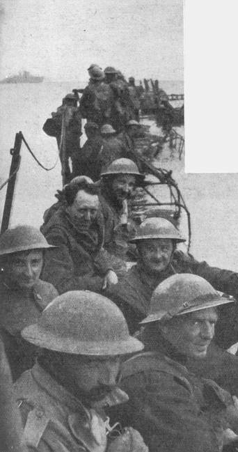 This picture shows British soldiers waiting to be evacuated from Dunkirk, on a makeshift pier made from abandoned lorries.