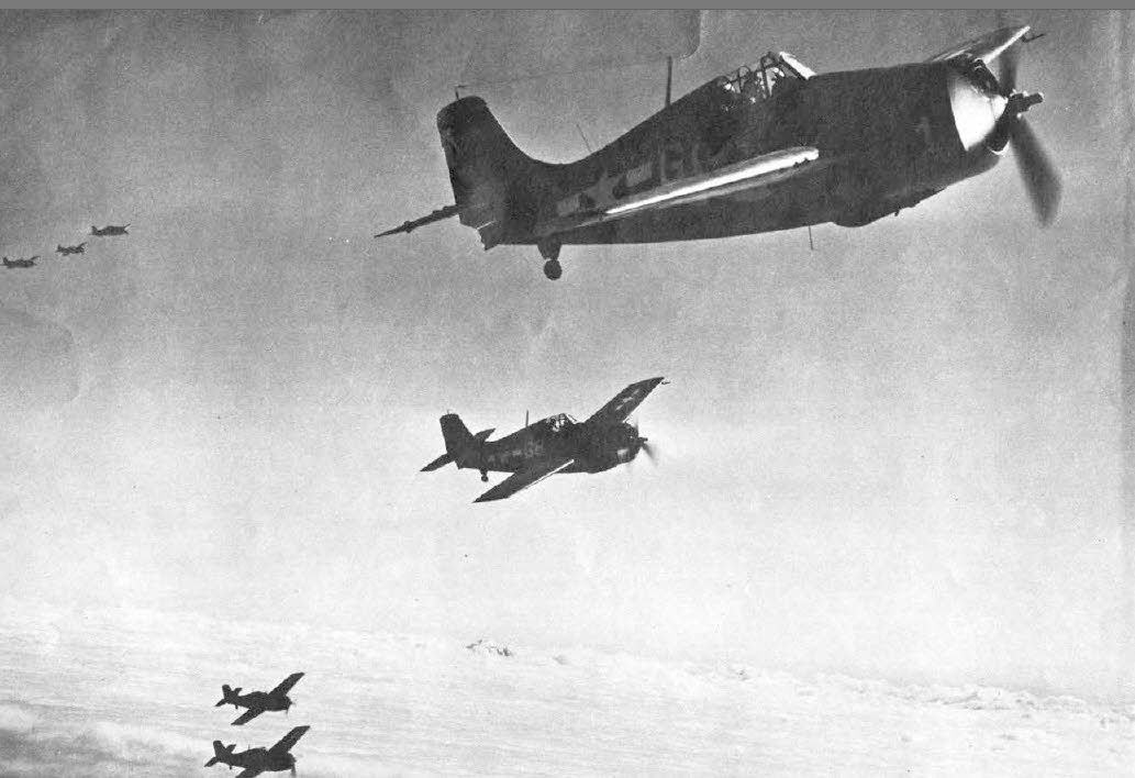 Here we see a formation of Eastern Aircraft FM-2 Wildcats, the last production version of the Grumman F4F Wildcat, and a lighter aircraft with better performance. Otherwise they are visually very similar to the F4F.