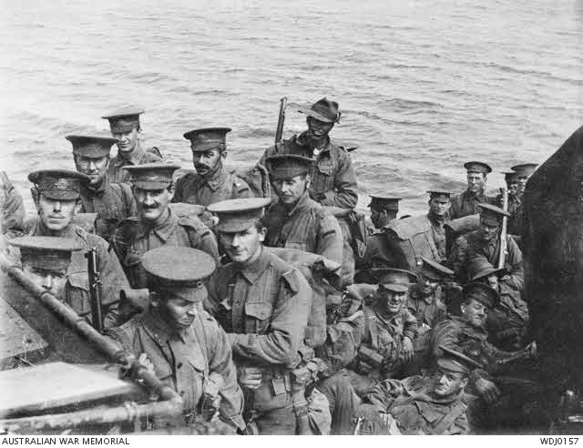 Here we see troops from either D Company, 9th Battalion or C Company, 12th Battalion, on the Beagle class destroyer HMS Beagle, just before the initial Allied landings at Gallipoli on 25 April 1915.