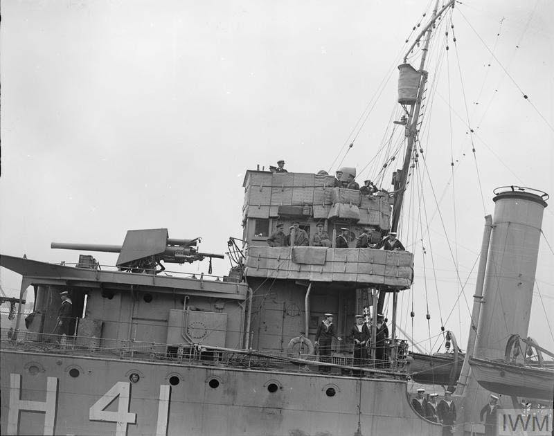 King George V on the bridge of the destroyer (H41) in which he reached Calais, 5 August 1918. - GV is on very top - middle of group of three, looking left
