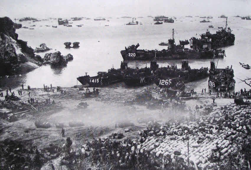 This picture shows the scale of the American effort at Okinawa, with a massive fleet in the background and vast piles of supplies in front. In the front are four LCT(6) - 1049, 1265 and 1415 plus 11??. Behind them is LSM 220