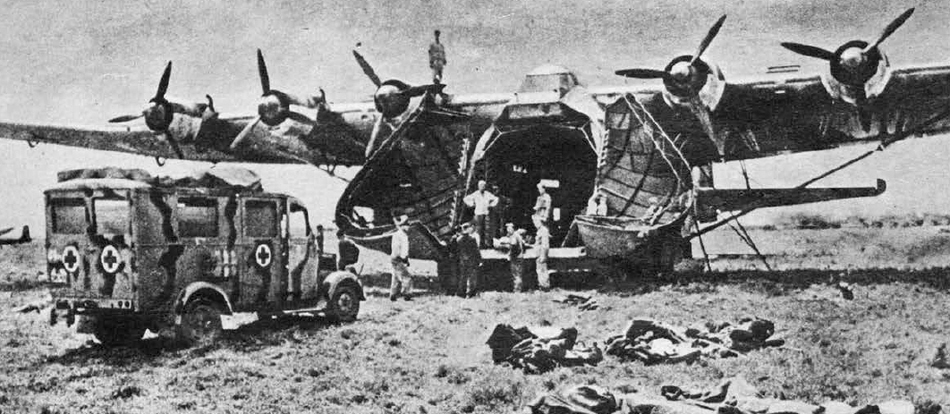 Here we see the large clamshell doors at the front of the Messerschmitt Me 323, apparently being used to load wounded men from the ambulance. One stretch can probably be seen on the floor of the glider.