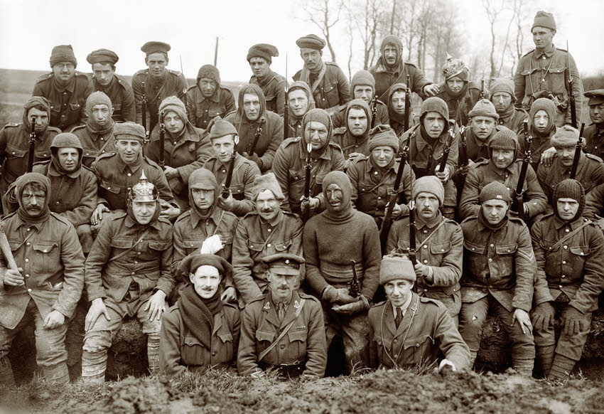 Here we see a raiding party from the 1st/8th (Irish) Battalion, King's Liverpool Regiment, taken on 18 April 1916. The party is wearing rather varied gear, including two German spiked helmets. Note the trench club at the far left.