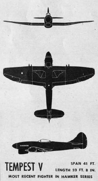 Here we see front, below and side plans of the Hawker Tempest V, despite the high number the first version of the aircraft to enter production. The most noteworthy feature of the design is the large air scope below the engine, which provided cooling for the Napier Sabre IIB engine.