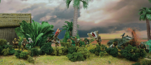 Infantry vs infantry melee is always deadly – both sides fight simultaneously, and the one that causes the most damage is the winner (unless it is actually wiped out). The loser is destroyed, representing the survivors surrendering. Melee combat is nice and simple. Each side rolls 1D6 for each figure in the unit, with the target number decided by the skill of their opponents – 3+ for inexperienced up to 5+ for veteran. Some units have the Tough Fighters rule which allows them to re-roll failed damage rolls.